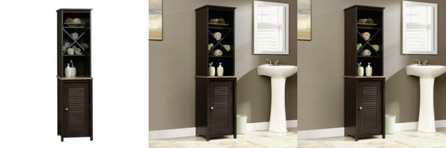 Sauder linen tower bath cabinet cinnamon cherry finish. Reversible door opens left or right. Open shelves contain clutter while keeping. Item 4 Sauder 414034 Peppercorn Linen Tower L.