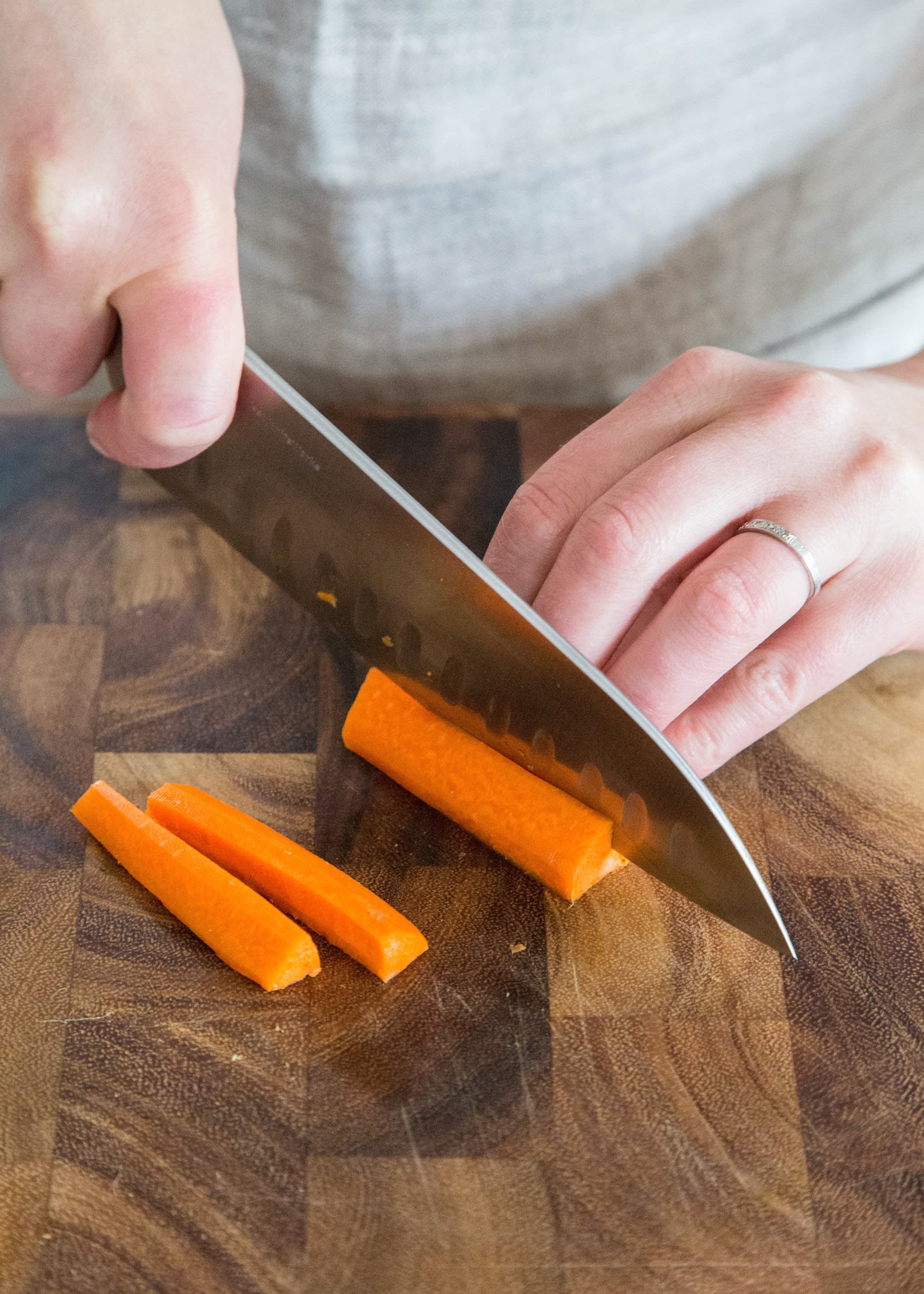 Peel the entire carrot from top to bottom. Chop off the top and bottom or top and tail of your carrots. To sliver green onion garlic or gingerroot use a cleaver or chefs knife to cut the food into 2-inch or shorter lengths.
