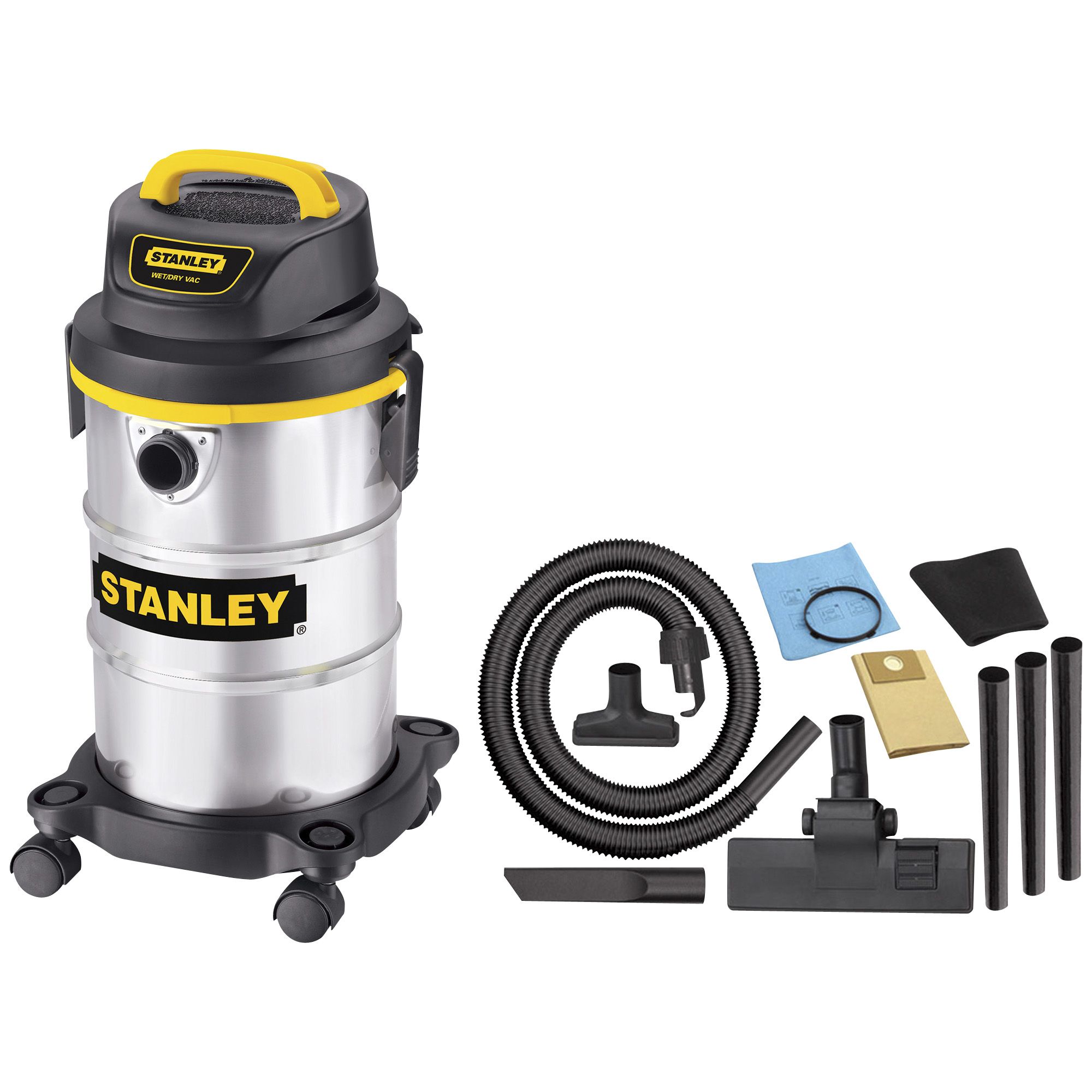 Stanley 5-gallon poly wet/dry vacuum - 3 hp. STANLEY WetDry Vacuums are ideal for wet and dry pick ups in your home garage workshop or vehicle. On-board accessory storage swiveling casters for easy maneuverability. Small Wet Dry.