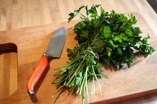 In respect to this do you use the stem of parsley. It is a wonderful flavoring agent but for most dishes it is too bitter and too tough. Set aside the stems and chop the leaves.